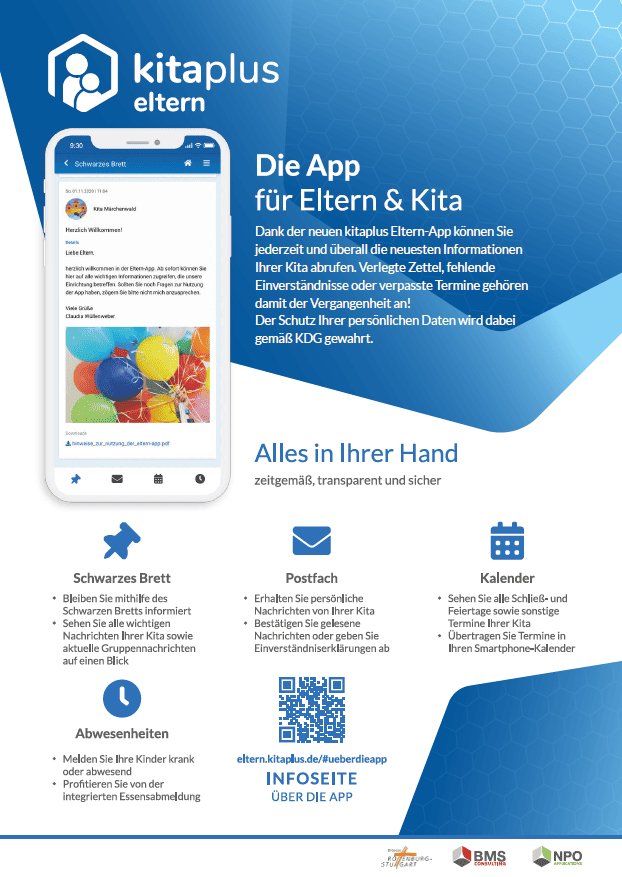 Für die betroffenen Einrichtungen wurde ein Plakat (DIN A2) erarbeitet, welches Eltern über die neue Eltern-App informiert. Das Plakat soll Kita-Leitung bei der Einführung der Eltern-App unterstützen.